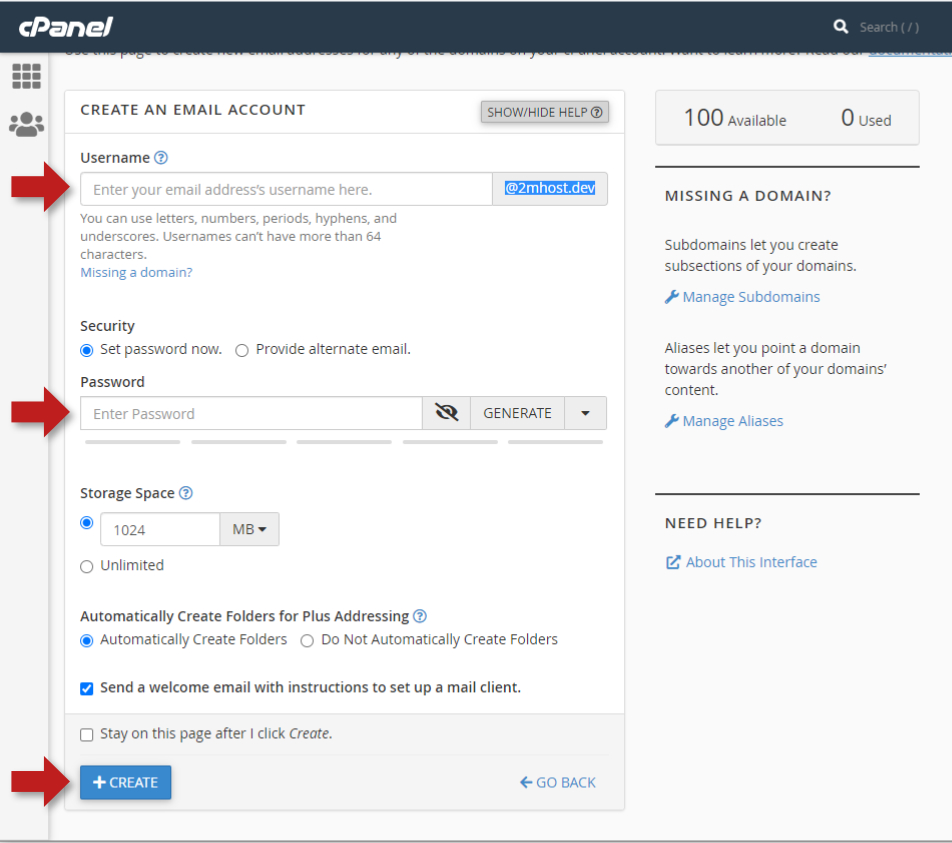 Fill in the user's name (the part of email before @yourdomain.com), choose hard-to-guess password and click 'create' button