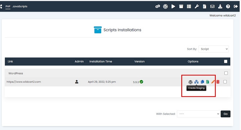- Click 'Create staging' icon of the live Wordpress.