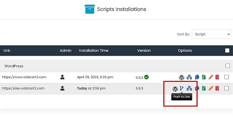 - Back to the list of installations, you can now login to the dashboard of the staging Wordpress, perform and test any changes you want.