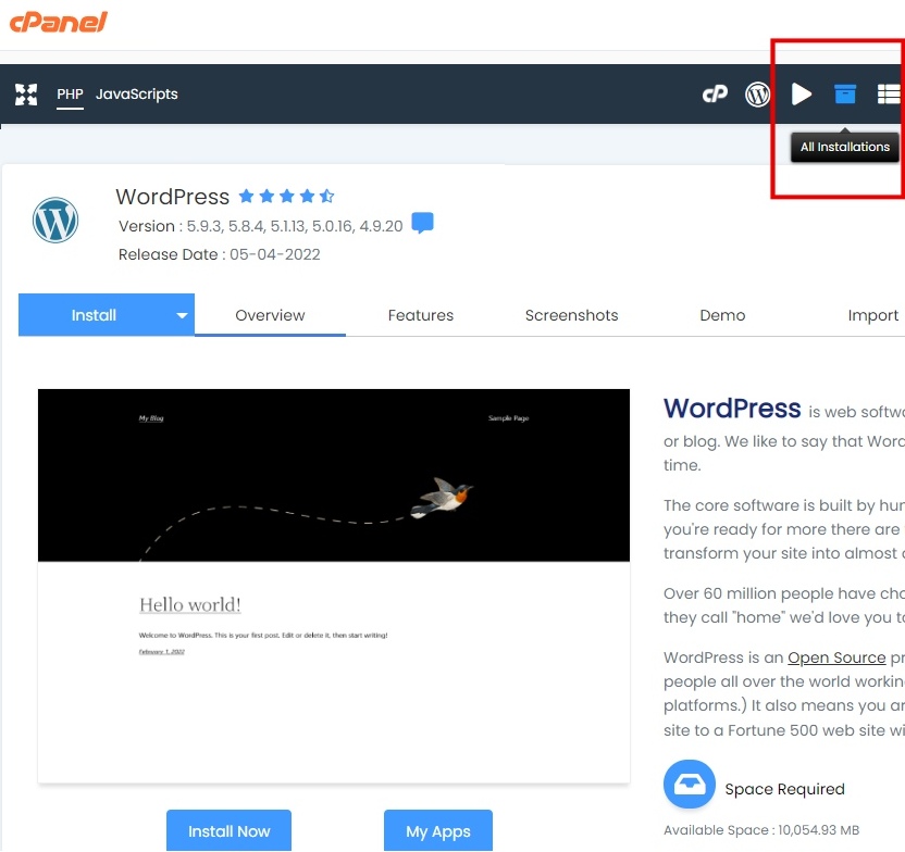 - Back to cPanel home page, scroll down to the Wordpress Icon under 'Softaculous Apps Installer'. Click on the 'All Installation' icon on the top menu and find your live Wordpress installation.